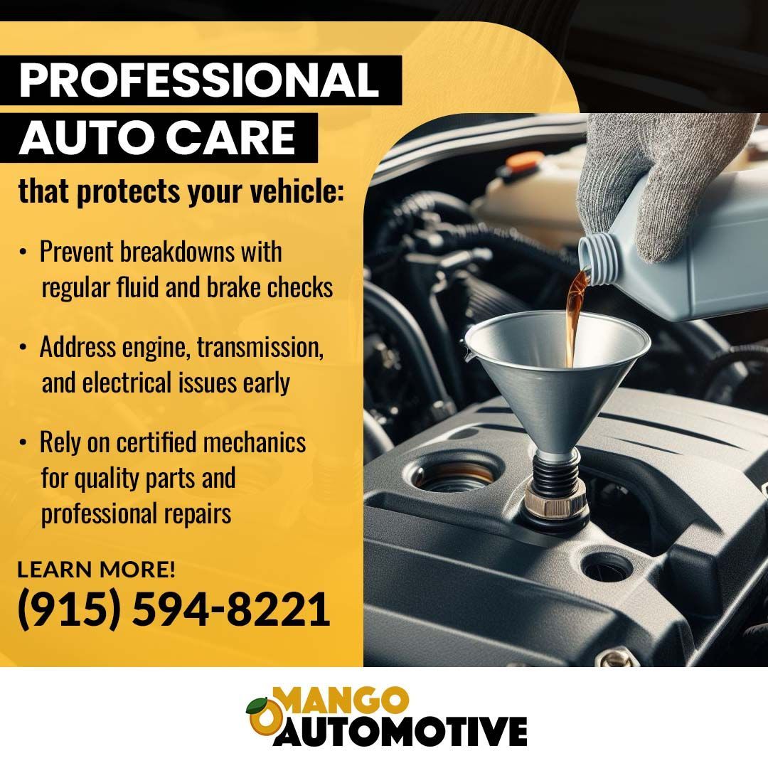 Finding a reliable auto mechanic in East El Paso is essential for keeping your vehicle safe and performing at its best. Regular maintenance, including oil changes, fluid checks, and brake inspections, can prevent costly repairs and extend your car’s lifespan. Addressing small issues early helps avoid major mechanical problems later. Mango Automotive is a trusted mechanical shop in East El Paso where certified auto mechanics provide expert care for a wide range of vehicles. Local car repair shops in East El Paso vary in quality, but we focus on accurate diagnostics, professional repairs, and long-term reliability. Our team delivers attention and service that keeps vehicles running smoothly and safely.