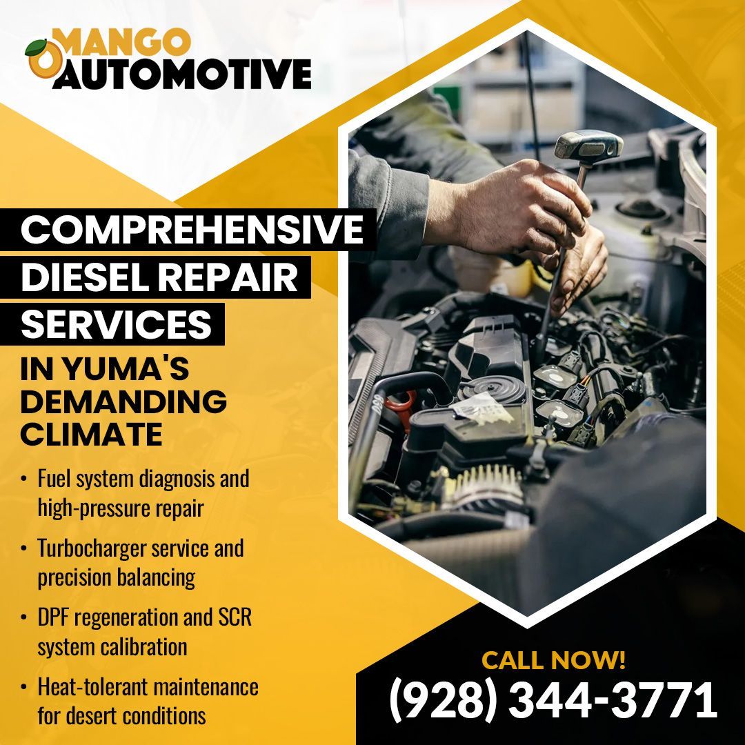 Mango Automotive & Diesel in Yuma, we specialize in comprehensive diesel services, including fuel system diagnostics, emission system maintenance, turbocharger service, and preventive care programs. Our ASE-certified