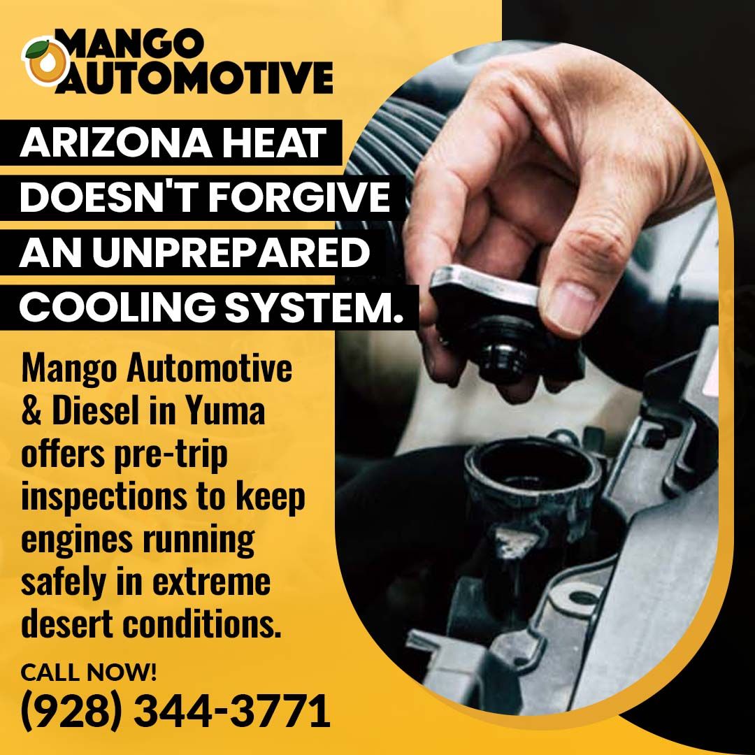 A cooling system check is a direct investment in your engine, your passengers, and your travel plans. Routine auto repair costs far less than the damage that follows an overheated engine on a remote highway. Drivers throughout Yuma and nearby areas trust Mango Automotive & Diesel for the kind of thorough, honest service that keeps vehicles ready for whatever the road ahead demands.