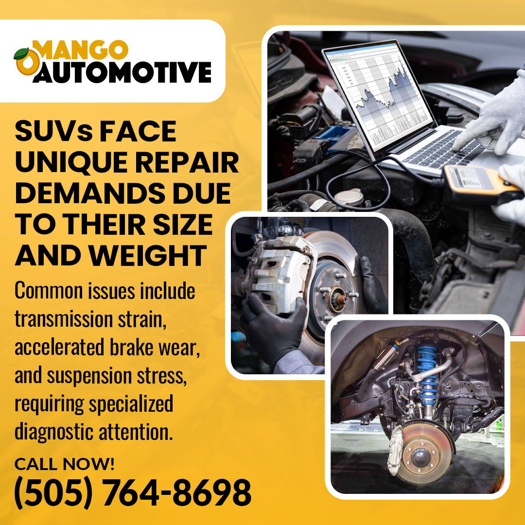SUVs and pickup trucks now make up 75% of total U.S. car sales in 2024, with SUVs alone capturing 58% of all vehicle transactions according to recent industry data. Given this market dominance, SUV owners need to understand the maintenance challenges these vehicles present. They require specialized maintenance due to their size and weight. Their larger size means more stress on parts. Their weight requires stronger braking systems. Many families use SUVs for towing and hauling, which adds extra wear on components. At Mango Automotive (Downtown) in Albuquerque, we understand these challenges and help SUV owners maintain their vehicles safely and reliably.