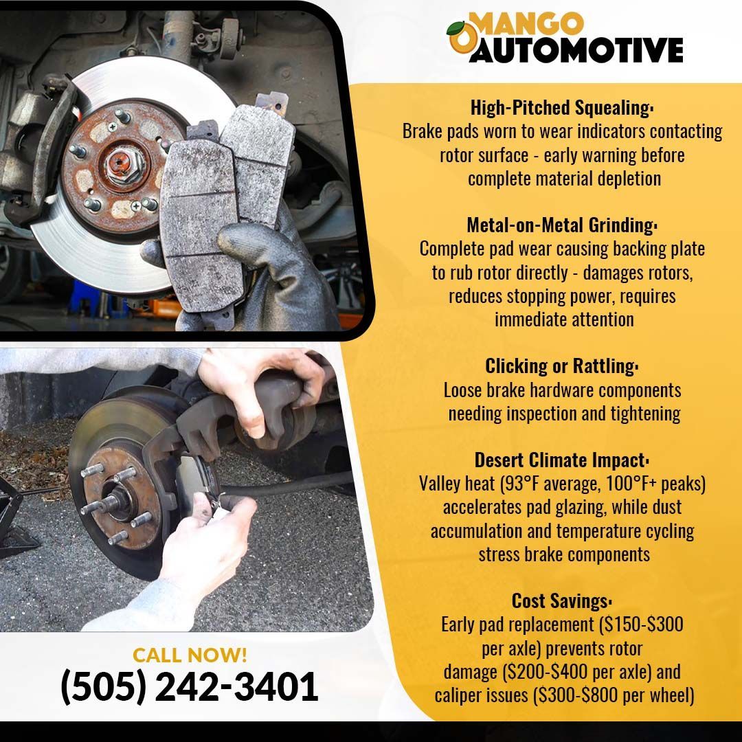 Mango Automotive (The Valley), we see Albuquerque drivers every day who've caught brake problems early simply by paying attention to unusual sounds. In this guide, we'll break down the different types of brake noises, what causes them in our local driving conditions, and when it's time to schedule a professional