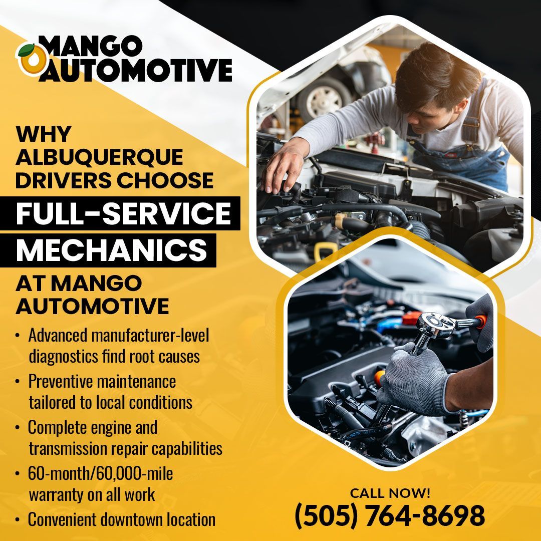 Mango Automotive continues to deliver expert repairs on engines, transmissions, brakes, and suspension systems. These services remain a key part of what drivers look for when searching for auto repair in Downtown Albuquerque.